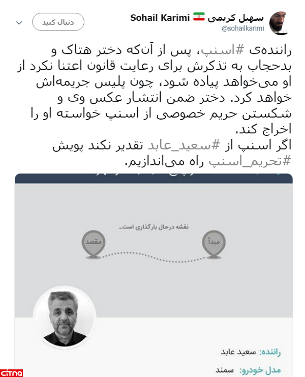 به گزارش سیتنا، سهیل کریمی مستندساز نسبت به برخورد تاکسی اینترنتی اسنپ با راننده شاغل در این مجموعه واکنش نشان داد و خواستار تقدیر از راننده قانونمدار شد.