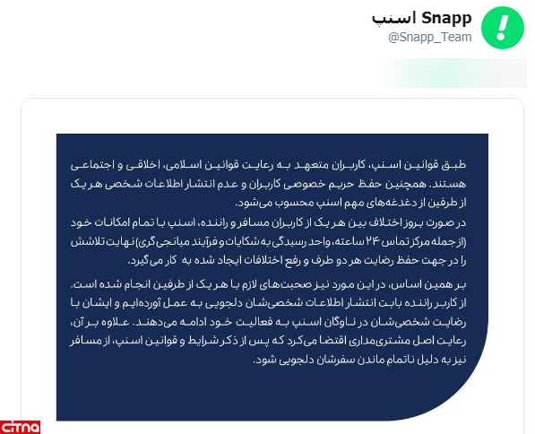 اسنپ با انتشار اطلاعیهای به انتقادات پاسخ داد و تأکید کرد که از راننده بابت انتشار اطلاعات شخصیاش دلجویی به عمل آمده و از مسافر نیز به دلیل ناتمام ماندن سفرش دلجویی شده است.
