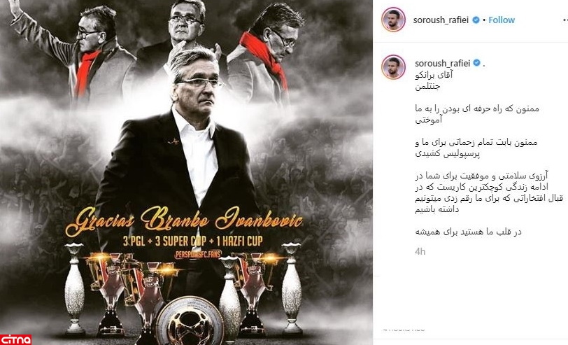 سروش رفیعی هافبک طراح پرسپولیس پیامی احساسی برای برانکو در اینستاگرام منتشر کرد.