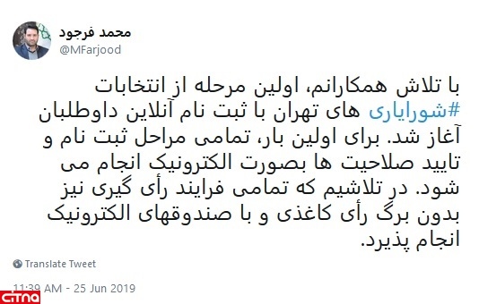 با تلاش همکارانم، اولین مرحله از انتخابات #شورایاری های تهران با ثبت نام آنلاین داوطلبان آغاز شد. برای اولین بار، تمامی مراحل ثبت نام و تایید صلاحیت ها بصورت الکترونیک انجام می شود. در تلاشیم که تمامی فرایند رأی گیری نیز بدون برگ رأی کاغذی و با صندوقهای الکترونیک انجام پذیرد.