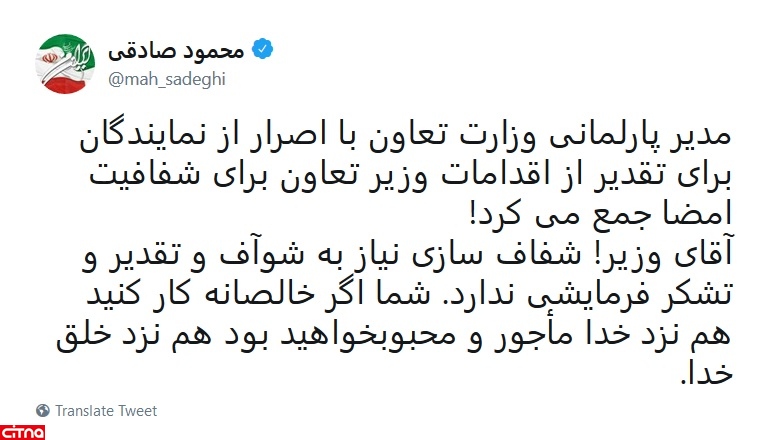 صادقی افزود: آقای وزیر! شفاف سازی نیاز به شوآف و تقدیر و تشکر فرمایشی ندارد. شما اگر خالصانه کار کنید هم نزد خدا مأجور و محبوبخواهید بود هم نزد خلق خدا.