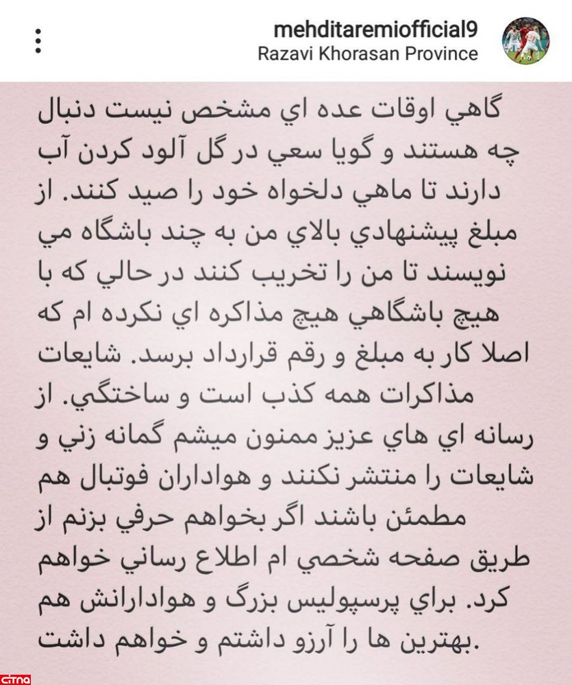 به گزارش سرویس وبگردی سیتنا، مهدی طارمی در واکنش به پیشنهاد پرسپولیس و حضور در این تیم متنی را در اینستاگرامش منتشر کرد.