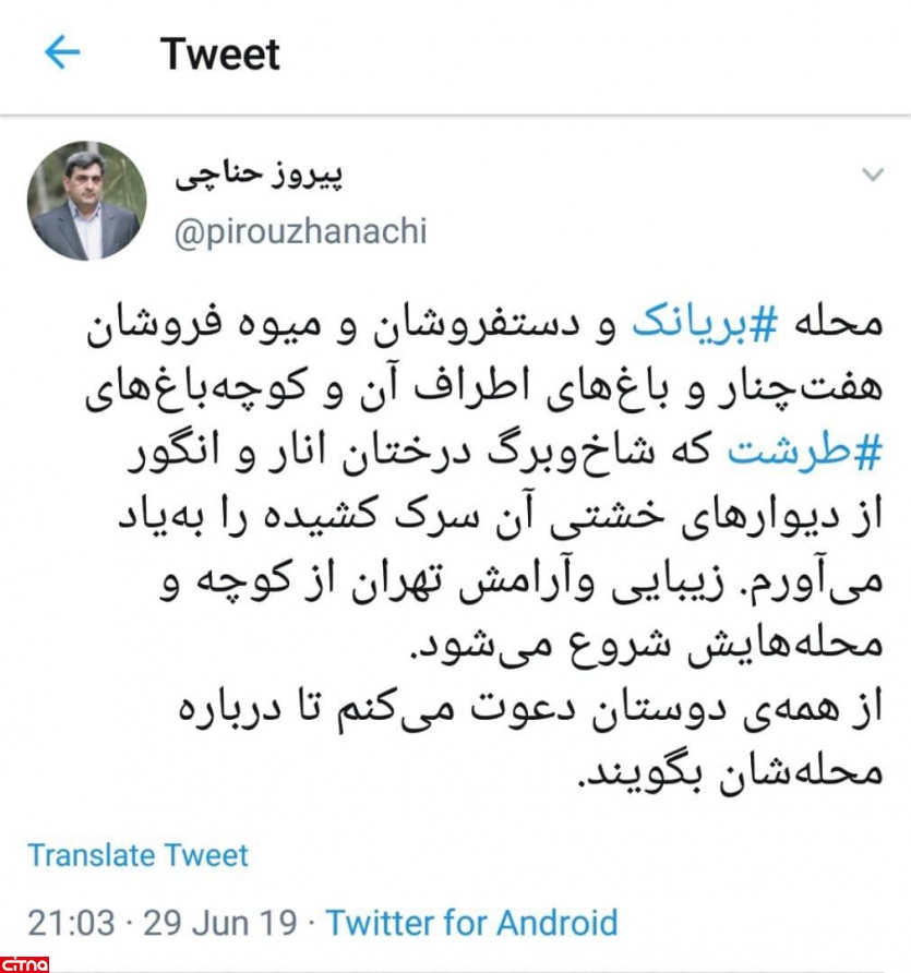به گزارش سیتنا، پیروز حناچی در توئیت خود این گونه نوشت: «محله بریانک و دستفروشان و میوه فروشان هفت چنار و باغ های اطراف آن و کوچه باغ های طرشت که شاخ و برگ درختان انار و انگور از دیوارهای خشتی آن سرک کشیده را به یاد می آورم. زیبایی و آرامش تهران از کوچه ها و محله هایش شروع می شود.