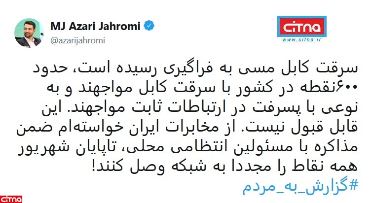 سرقت کابل مسی به فراگیری رسیده است، حدود ۶۰۰نقطه در کشور با سرقت کابل مواجهند و به نوعی با پسرفت در ارتباطات ثابت مواجهند. این قابل قبول نیست. از مخابرات ایران خواستهام ضمن مذاکره با مسئولین انتظامی محلی، تاپایان شهریور همه نقاط را مجددا به شبکه وصل کنند!