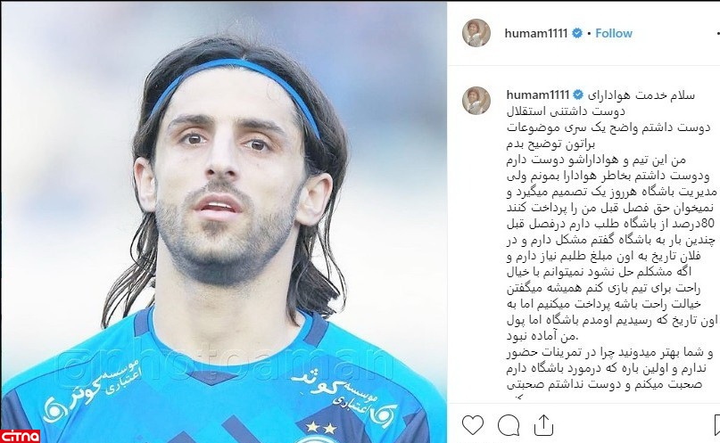 من این تیم و هواداراشو دوست دارم و دوست داشتم بخاطر هوادارا بمونم، ولی مدیریت باشگاه هرروز یک تصمیم می گیرد و نمیخوان حق فصل قبل من را پرداخت کنند ۸۰ درصد از باشگاه طلب دارم درفصل قبل چندین بار به باشگاه گفتم مشکل دارم و در فلان تاریخ به اون مبلغ طلبم نیاز دارم و اگه مشکلم حل نشود نمیتوانم با خیال راحت برای تیم بازی کنم همیشه میگفتن خیالت راحت باشه پرداخت میکنیم، اما به اون تاریخ که رسیدیم اومدم باشگاه، اما پول من آماده نبود؛ و شما بهتر میدونید چرا در تمرینات حضور ندارم و اولین باره که درمورد باشگاه دارم صحبت میکنم و دوست نداشتم صحبتی کنم