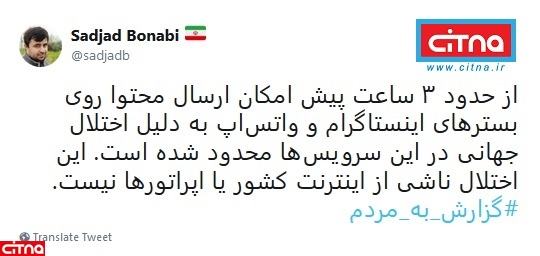 در همین حال، سجاد بنابی، نائب رئیس هیات مدیرهی شرکت ارتباطات زیرساخت هم توئیت کرد: از حدود ۳ ساعت پیش امکان ارسال محتوا روی بسترهای اینستاگرام و واتساپ به دلیل اختلال جهانی در این سرویسها محدود شده است. این اختلال ناشی از اینترنت کشور یا اپراتورها نیست.