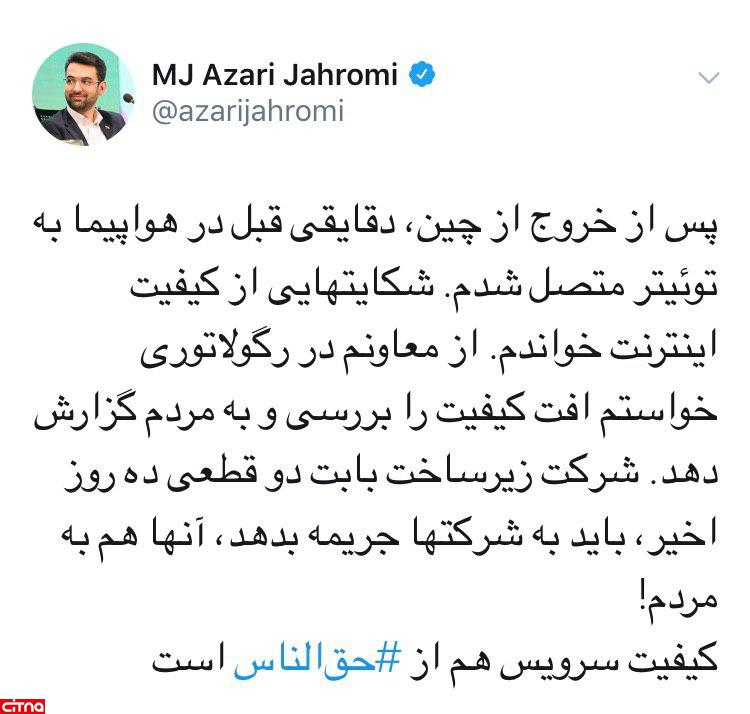 پس از خروج از چین، دقایقی قبل در هواپیما به توئیتر متصل شدم. شکایتهایی از کیفیت اینترنت خواندم. از معاونم در رگولاتوری خواستم افت کیفیت را بررسی و به مردم گزارش دهد. شرکت زیرساخت بابت دو قطعی ده روز اخیر، باید به شرکتها جریمه بدهد، آنها هم به مردم! کیفیت سرویس هم از #حقالناس است.
