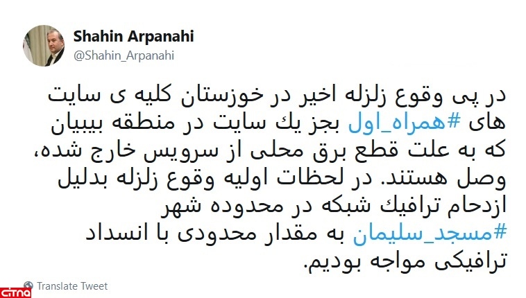 در پى وقوع زلزله اخیر در خوزستان کلیهى سایت هاى #همراه_اول بجز یک سایت در منطقه بیبیان که به علت قطع برق محلى از سرویس خارج شده، وصل هستند. در لحظات اولیهی وقوع زلزله بدلیل ازدحام ترافیک شبکه در محدوده شهر #مسجد_سلیمان به مقدار محدودى با انسداد ترافیکى مواجه بودیم.