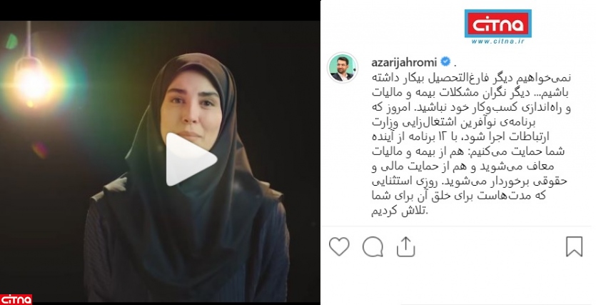 نمیخواهیم دیگر فارغالتحصیل بیکار داشته باشیم... دیگر نگران مشکلات بیمه و مالیات و راهاندازی کسبوکار خود نباشید. امروز که برنامهی نوآفرین اشتغالزایی وزارت ارتباطات اجرا شود، با ۱۲ برنامه از آینده شما حمایت میکنیم: هم از بیمه و مالیات معاف میشوید و هم از حمایت مالی و حقوقی برخوردار میشوید. روزی استثنایی که مدتهاست برای خلق آن برای شما تلاش کردیم.