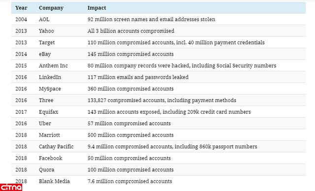 بر اساس جدول زیر، بالغ بر ۹۳ میلیون حساب کاربری پست الکترونیکی و نام کاربری در شرکت AOL در سال ۲۰۰۴ میلادی توسط هکرها و مجرمان سایبری به سرقت رفت.