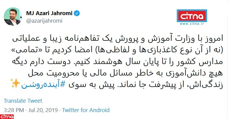 به گزارش سیتنا، مهندس آذری جهرمی توئیت کرد: