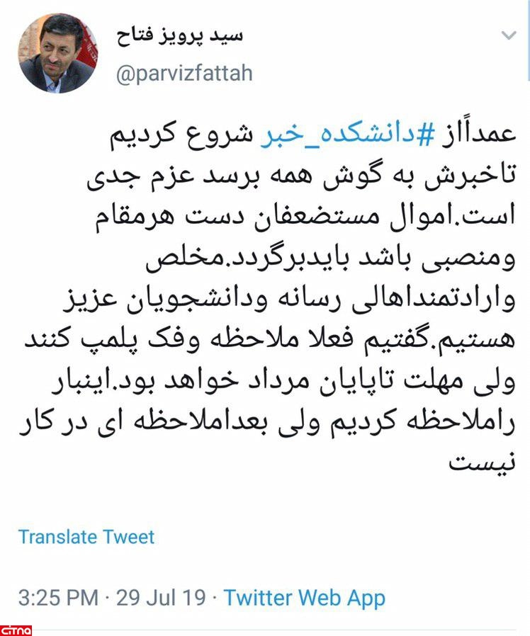 توئیت فتاح پیرامون پلمپ دانشکدهی خبر؛ اموال مستضعفان دست هر مقام و منصبی باشد باید برگردد