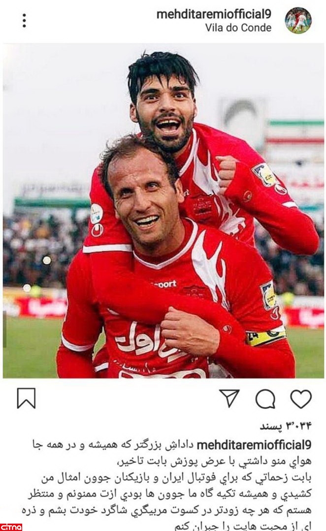 بابت زحماتی که برای فوتبال ایران و بازیکنان جوون امثال من کشیدی و همیشه تکیه گاه ما جوونها بودی ازت ممنونم و منتظر هستم که هر چه زودتر در کسوت مربیگری شاگرد خودت بشم و ذرهای از محبت هایت را جبران کنم.