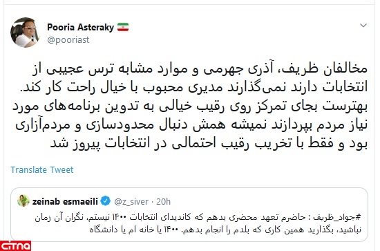 مخالفان ظریف، آذری جهرمی و موارد مشابه ترس عجیبی از انتخابات دارند و نمی‌گذارند مدیری محبوب با خیال راحت کار کند. بهترست بجای تمرکز روی رقیب خیالی به تدوین برنامه‌های مورد نیاز مردم بپردازند نمیشه همش دنبال محدودسازی و مردم‌آزاری بود و فقط با تخریب رقیب احتمالی در انتخابات پیروز شد.
