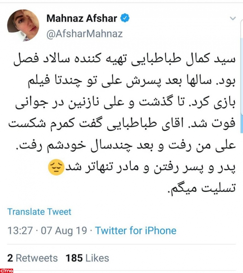 مهناز افشار در پی در گذشت سیدکمال طباطبایی، تهیهکننده سینما که امروز (چهارشنبه ۱۶ مرداد) به علت ایست قلبی در گذشت. توئیتی را منتشر کرد.
