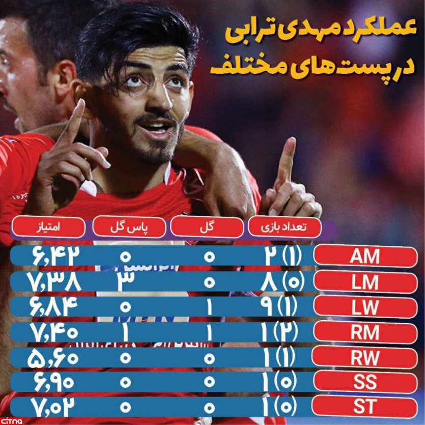 مهدی ترابی فصل گذشته در ۷ پست مختلف بازی کرد! بهترین عملکرد ترابی در ۳ مسابقهای بود که به عنوان هافبک راست (RM) بازی کرد. ترابی در یک نیمهای که با لباس پرسپولیس مقابل تیم سابقش قرار گرفت، ۱ گل به سایپا زد و ۱ پاسگل داد. این جزو معدود بازیهایی بود که ترابی در سمت راست خط هافبک قرار گرفت.