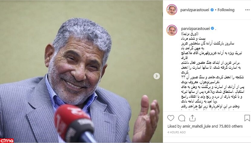 ۲۶ مرداد، سالگرد آزادی اسیران جنگ تحمیلی و آغاز بازگشت آنان به میهن است. پرویز پرستویی، به همین مناسبت، با انتشار پستی، صفحه اینستاگرام خود را بهروز کرد.