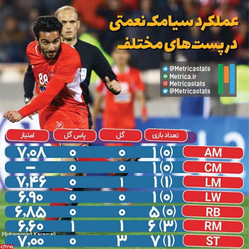 سیامک نعمتی را باید مرد همهکاره پرسپولیس دانست. بازیکنی که در هفت پست گوناگون به میدان رفت. در واقع او از اندک بازیکنانی است که در فوتبال ایران توانایی بازی در خطوط سه گانه را دارد.