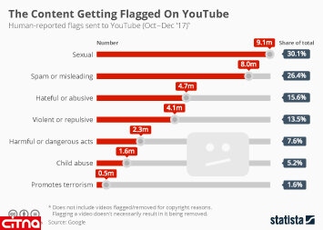 طبق آمار نمودار بالا، بالغ بر ۳۰.۱ درصد از ویدیوهای منتشر شده داری محتوای جنسی و غیراخلاقی، ۲۶.۴ درصد محتوی اخبار کذب و نادرست، ۱۵.۶ درصد محتوی انزجار عمومی و سواستفاده از گروههای مختلف مردم، ۱۳.۵ درصد دارای محتوای خشونت آمیز، ۷.۶ درصد محتوی رفتارهای خطرآفرین، ۵.۲ درصد محتوی کودک آزاری و ۱.۶ درصد نیز محتوی فعالیتهای تروریستی بودهاند.