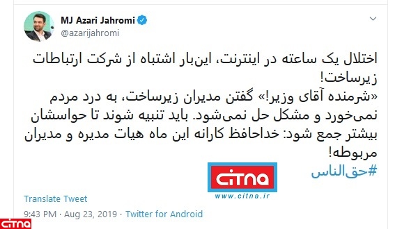 وزیر ارتباطات و فناوری اطلاعات، تاکید کرد: اختلال یک ساعته در اینترنت، اینبار اشتباه از شرکت ارتباطات زیرساخت!