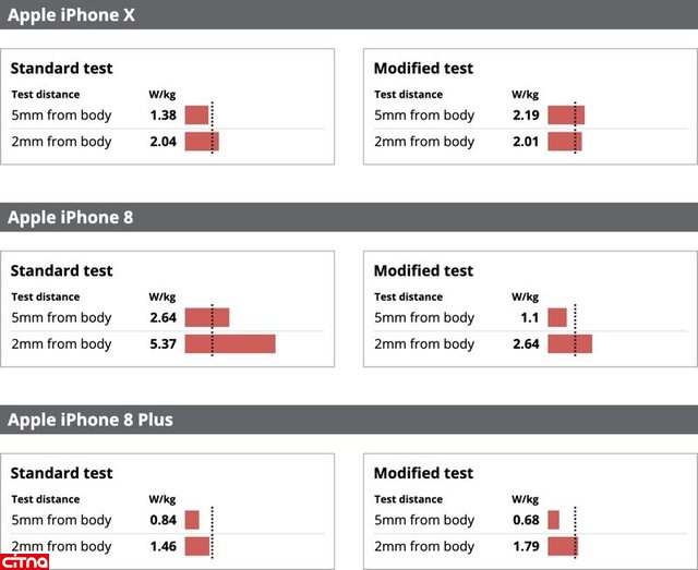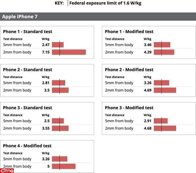 بر اساس جدول و نمودارهای زیر که نشان میدهد گوشیهای آزمایش شده از برند اپل قدرت نفوذ بیشتری به بافتهای بدن نسبت به حد استاندارد دارند که در این میان، مدل آیفون ۷ بیشترین تخطی و میزان تشعشعات ساطع شده را به نام خود ثبت کرده است. این در حالیست که آیفون ۸ و ۸ پلاس عملکرد مناسب و خوبی را از این لحاظ به خود اختصاص داده اند و این بدان معناست که میزان تشعشعات و قدرت نفوذ فرکانسهای رادیویی به بافتهای بدن در آن از حد استاندارد تجاوز نکرده است.