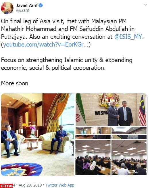 به گزارش سرویس وبگردی سیتنا، وزیر امور خارجه ایران در سومین مقصد سفرش به شرق آسیا و در مالزی در گزارشی تویئتری نوشت: