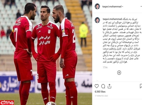 به گزارش سرویس وبگردی سیتنا، محمد تقوی، پس از برتری تراکتور برابر پرسپولیس، با انتشار پستی در اینستاگرامش نوشت: