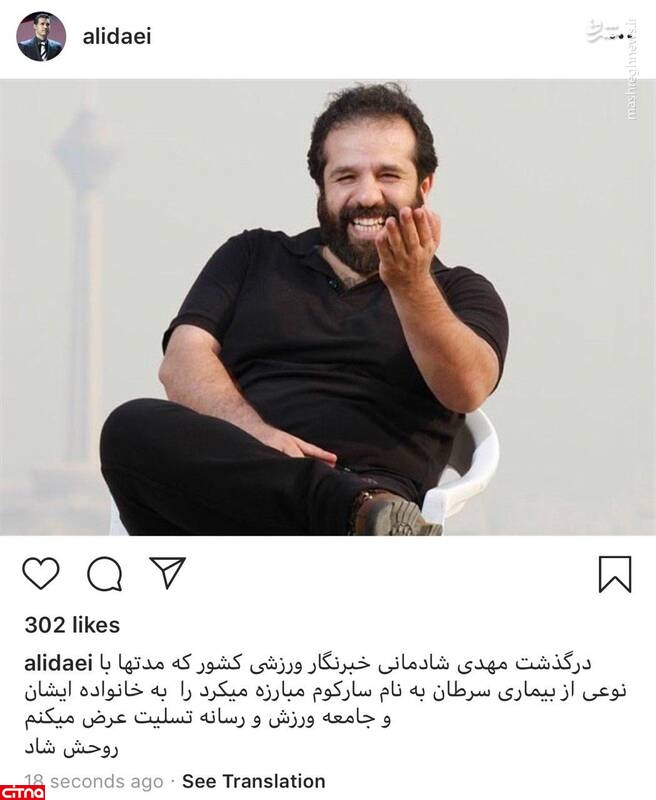 به گزارش سرویس وبگردی سیتنا، علی دایی پیشکسوت فوتبال و سرمربی پیشین سایپا با اتشار تصویری از مرحوم مهدی شادمانی در صفحه اینستاگرامش درگذشت این خبرنگار باسابقه ورزشی را تسلیت گفت.