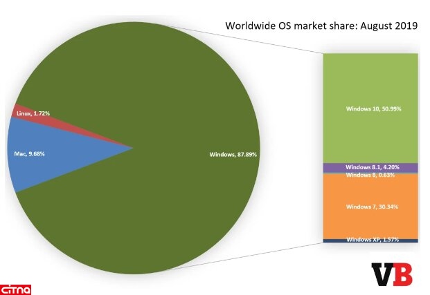 بر اساس نمودار دایرهای زیر، سهم نسخههای مختلف سیستم عامل ویندوز در کنار سهم سایر سیستم عامل های رایانهای همچون مکاواس و لینوکس به ترتیب ذکر شده است: