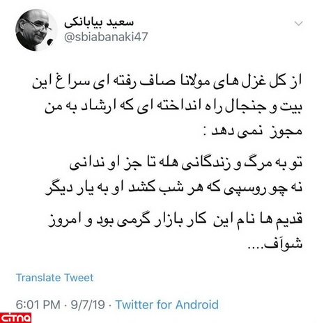 سعید بیابانکی در توئیتی به ماجرای سانسور یکی از اشعار مولانا که ترانه اصلی آلبوم «قمارباز» محسن چاوشی است پاسخ داد.