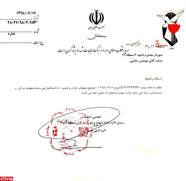 محمدی در ادامه توییتر خود نامه رئیس اداره بنیاد شهید و امور ایثارگران منطقه ۱۲ را که خطاب به مهندس حاتمی شهردار ناحیه ۳ منطقه ۱۲ مبنی بر اینکه شهدایی که اسمشان در کلیپ منتشر شده، در سیستم بنیاد شهید نیستند، منتشر شد.