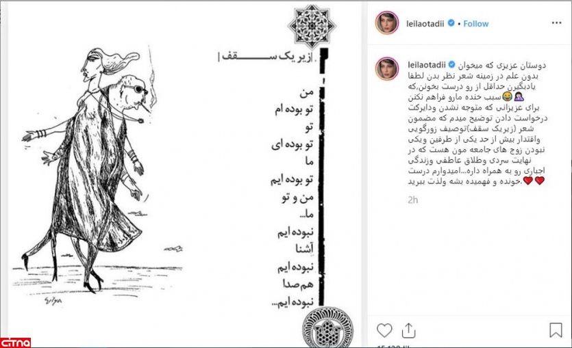 به گزارش سرویس وبگردی سیتنا، لیلا اوتادی با انتشار متن یکی از اشعارش در اینستاگرام، به انتقادها نسبت به محتوای این اثر واکنش نشان داد و نوشت: «دوستان عزیزی که میخوان بدون علم در زمینه شعر نظر بدن لطفا یاد بگیرن حداقل از رو درست بخونن که سبب خنده مارو فراهم نکنن. برای عزیزانی که متوجه نشدن و دایرکت درخواست دادن توضیح میدم که مضمون شعر (زیریک سقف)توصیف زورگویی واقتدار بیش از حد یکی از طرفین و یکی نبودن زوجهای جامعه مون هست که در نهایت سردی و طلاق عاطفی و زندگی اجباری رو به همراه داره...امیدوارم درست خونده و فهمیده بشه ولذت ببرید.»