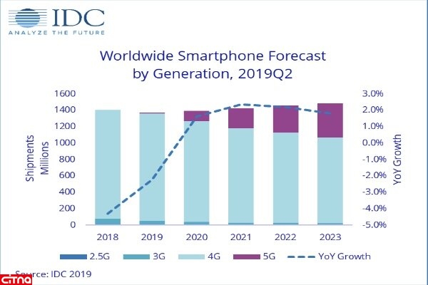 طبق این گزارش ظهور استاندارد اینترنت۵G نشانه امیدی برای بازار جهانی موبایل است. هم اکنون در بسیاری از مناطق جهان این استاندارد بهره برداری شده و به نظر می رسد در ۲۰۲۰ میلادی نفوذ اینترنت ۵G بیشتر شود. همچنین IDC پیش بینی می کند تعداد محموله موبایل های ۵G به ۸.۹ درصد کل موبایل هایی برسد که در ۲۰۲۰ بارگیری می شوند. این میزان معادل۱۲۳.۵ میلیون دستگاه است. همچنین تخمین زده می شود تعداد محموله های موبایل های۵G تا ۲۰۲۳ میلادی به ۲۸.۱ درصد برسد.