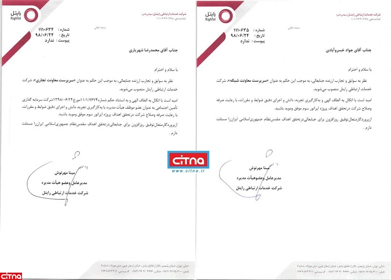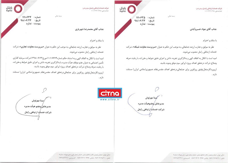 به گزارش سیتنا، مینا مهرنوش مدیرعامل جدید رایتل در احکامی "جواد خسرو آبادی" را به سمت "سرپرست معاونت شبکه" و "محمدرضا شهریاری" را به سمت "سرپرست معاونت تجاری" این اپراتور منصوب کرد.