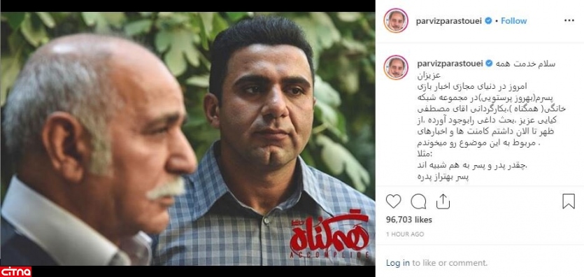به گزارش سرویس وبگردی سیتنا، پرویز پرستویی در اینستاگرام نوشت: «امروز در دنیای مجازی اخبار بازی پسرم (بهروز پرستویی) در مجموعه شبکه خانگی (همگناه )، به کارگردانی اقای مصطفی کیایی عزیز ، بحث داغی را بوجود آورده ،از ظهر تا الان داشتم کامنت ها و اخبارهای مربوط به این موضوع رو میخوندم . مثلا: چقدر پدر و پسر به هم شبیه اند. پسر بهتراز پدره