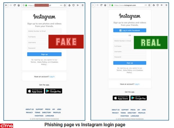 همچنین گاهی کلاهبرداران به جای نمایش دامنه instagram.com در قسمت نوار آدرس جستجوگر وب، از دامنه .CF استفاده میکنند. (این دامنه مربوط به آفریقای مرکزی است). بنابراین حتی اگر فردی قفل سبز را دید که میگوید ارتباط ایمن است، بررسی این مسئله که دامنه مورداستفاده توسط وبسایت، قانونی بوده و معتبر است، ضرروی به حساب میآید. برای جلوگیری از قرار گرفتن در معرض کلاهبرداری فیشینگ در اینستاگرام، مانند این، هرگز نباید اطلاعات نام کاربری و رمزعبور خود را در صفحاتی که متعلق به وبسایت instagram.com نیست، وارد کنید.