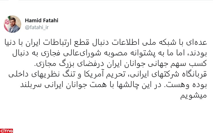 به گزارش سیتنا، حمید فتاحی در صفحه توئیتر خود اعلام کرد: عدهای با شبکه ملی اطلاعات دنبال قطع ارتباطات ایران با دنیا بودند اما ما به پشتوانه مصوبه شورای عالی فضای مجازی، به دنبال کسب سهم جهانی جوانان ایرانی در فضای بزرگ مجازی هستیم.