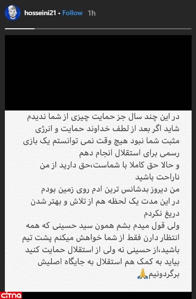 سید حسین حسینی دروازه بان استقلال پس از شکست در دربی پیامی را در فضای مجازی منتشر کرد.