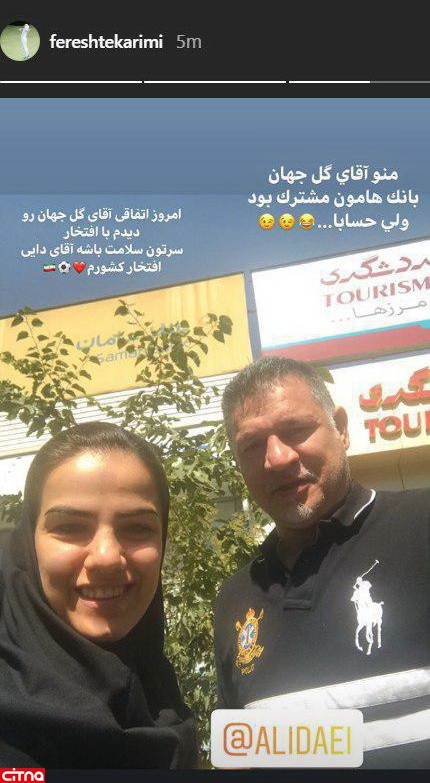در این استوری که عکسی از فرشته کریمی و علی دایی دیده می شود نوشته شده؛ من و آقای گل جهان بانک هامون مشترک بود ولی حساب هامون...