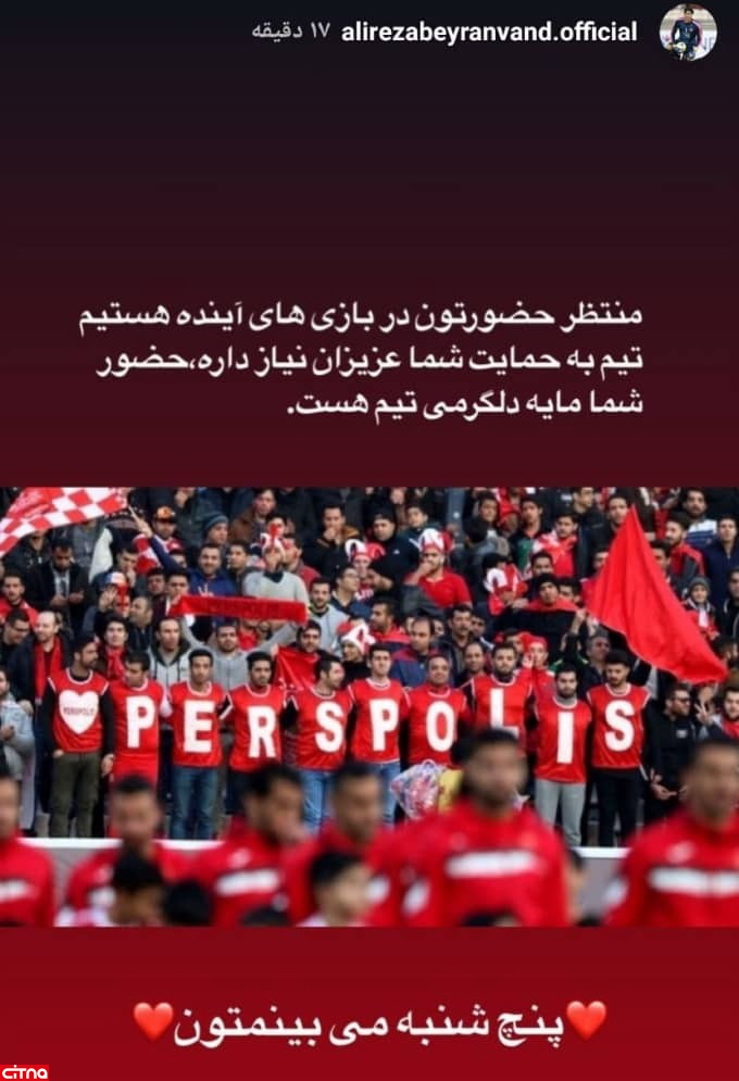 درخواست اینستاگرامی علیرضا بیرانوند از هواداران پرسپولیس