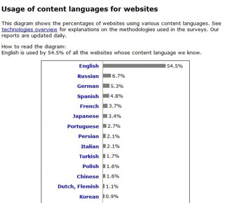 این درحالی است که طبق این گزارش، زبان انگلیسی توسط ۵۴.۵ درصد از وبسایتها مورد استفاده قرار میگیرد و پس از آن، زبان روسی با ۶.۷ درصد قرار دارد. همچنین در رتبههای بالاتر از زبان فارسی، آلمانی با ۵.۳ درصد، اسپانیایی با ۴.۸ درصد، فرانسوی با ۳.۷ درصد، ژاپنی با ۳.۴ درصد و پرتغالی با ۲.۷ درصد قرار دارد.