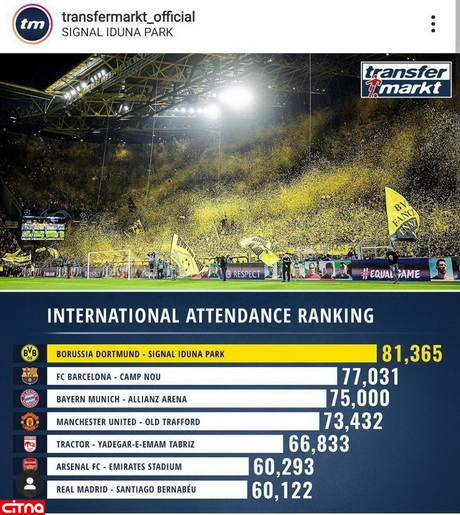 در این ردهبندی هواداران دورتموند در صدر قرار دارند و بارسلونا، بایرنمونیخ و منچستریونایتد بالاتر از تراکتور ایران در ردههای دوم تا چهارم هستند.