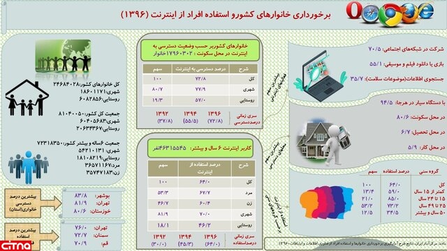 به گزارش سیتنا، آخرین اطلاعات مرکز آمار ایران از وضعیت برخورداری خانوارهای کشور و استفاده افراد از اینترنت در پایان سال ۱۳۹۶ نشان میدهد که از کل خانوارهای ایرانی که حدود ۲۴ میلیون و ۶۸۴ هزار نفر بودهاند، ۱۷ میلیون و ۹۶۰ هزار نفر به اینترنت در محل سکونت خود دسترسی داشتند. در نتیجه بیش از شش میلیون نفر در محل سکونت خود به اینترنت دسترسی نداشتند.