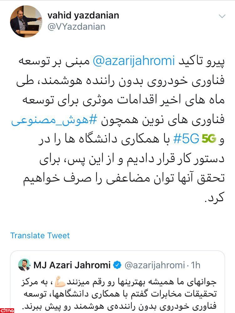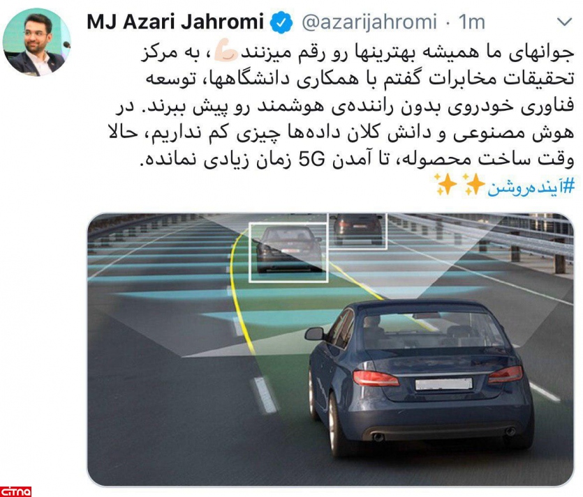 گفتنی است، وزیر ارتباطات در توئیتی اعلام کرده بود تا مرکز تحقیقات مخابرات برای توسعهی فناوری خودروی هوشمند بدون راننده با همکاری دانشگاهها، اقدام کند.