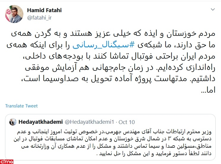 به گزارش سیتنا، مهندس حمید فتاحی، معاون وزیر ارتباطات و فناوری اطلاعات، در پاسخ به توئیت گلایهآمیز هدایت الله خادمی، نماینده مردم ایذه و باغملک در مجلس مبنی بر عدم دسترسی به شبکه سه در شمال شرق خوزستان، نوشت: