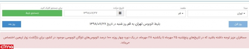 یکی از سایتهای فروش بلیت اتوبوس در تمام مسیرها و روزهای هفته، پیام زیر را برای کاربران به نمایش گذاشته است: