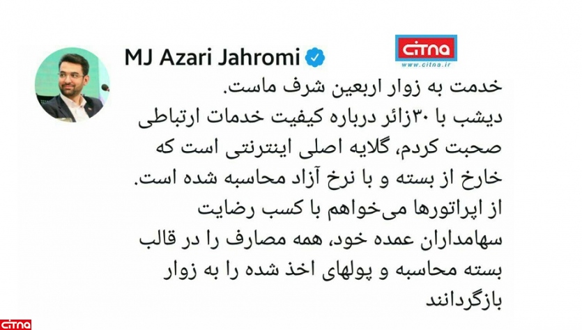 وزیر ارتباطات و فناوری اطلاعات، گفت: دیشب با ۳۰زائر درباره کیفیت خدمات ارتباطی صحبت کردم، گلایه اصلی اینترنتی است که خارج از بسته و با نرخ آزاد محاسبه شده است.