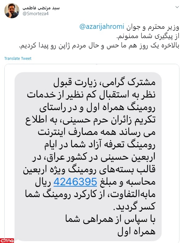 به گزارش سیتنا، سید مرتضی فاطمی، فعال توئیتری، در توئیتی خطاب به وزیر ارتباطات، گفت: