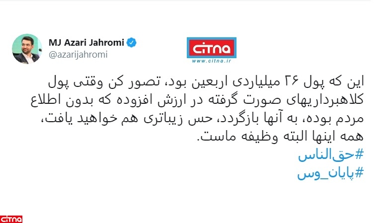 وزیر ارتباطات و فناوری اطلاعات، گفت: وقتی پول کلاهبرداریهای صورت گرفته در ارزش افزوده که بدون اطلاع مردم بوده، به آنها بازگردد، حس زیباتری خواهید یافت.
