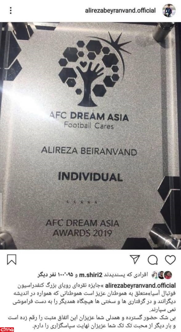 به گزارش سرویس وبگردی سیتنا، علیرضا بیرانوند دروازهبان تیم ملی فوتبال ایران و پرسپولیس پس از دریافت جایزه نقرهای کنفدراسیون فوتبال آسیا، در صفحه اینستاگرامش نوشت: